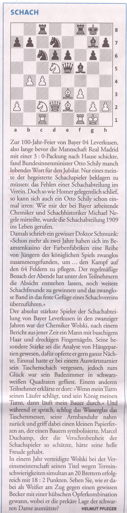 Am 11.11.2004 erschien in der von Helmut Pfleger betreuten Schachspalte der Zeitung "Die Zeit" ein kleiner Artikel zur Historie unseres Vereins (siehe unten). Endlich wird hier einmal richtiggestellt, dass Bayer sehr wohl einen Schachclub - nämlich uns!! - hat. Bei der 100-Jahr-Feier von Bayer 04 Leverkusen wurde das leider vergessen! |